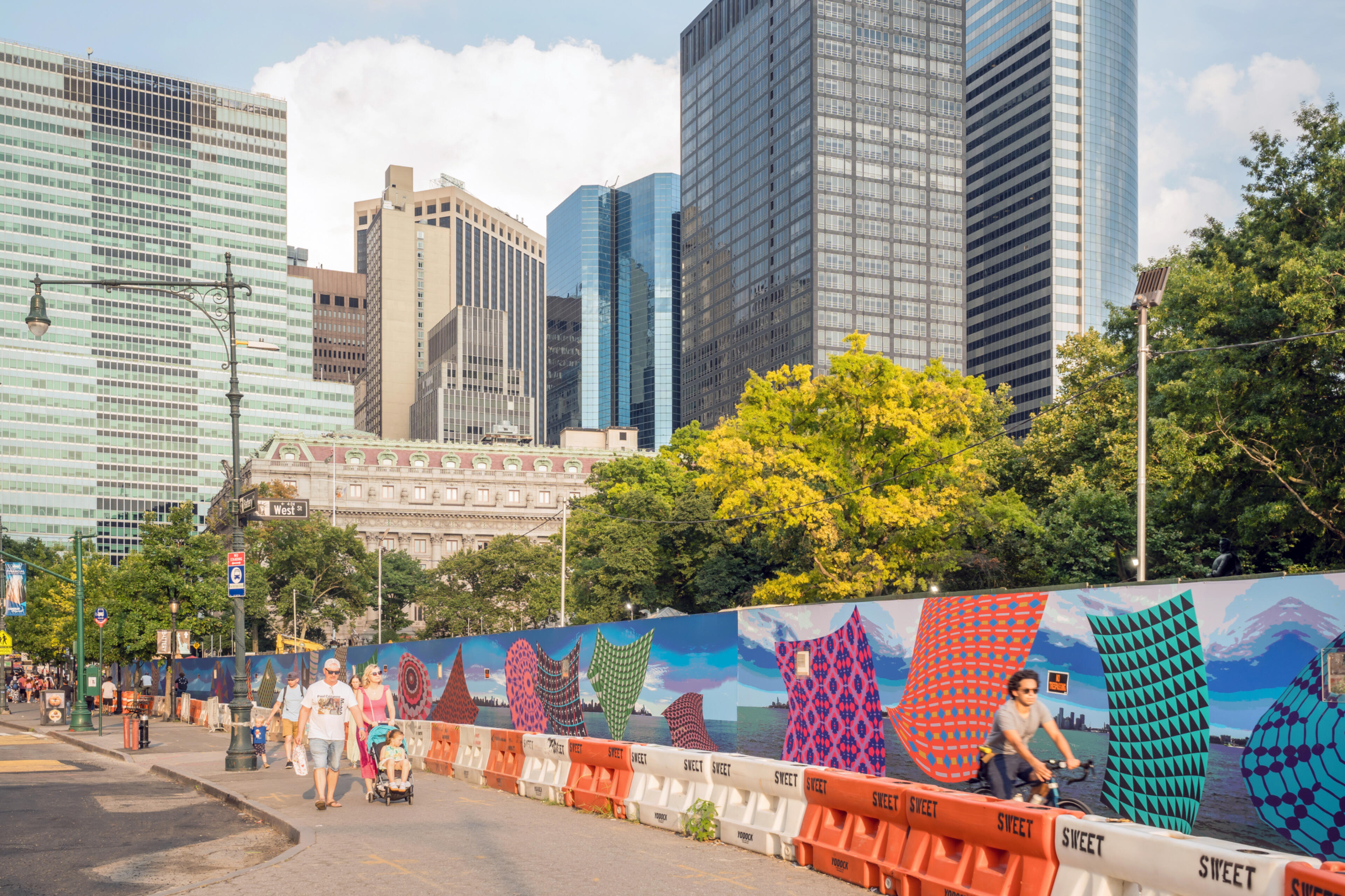 Geo Grid, NYC32 lamp posts, lower Broadway